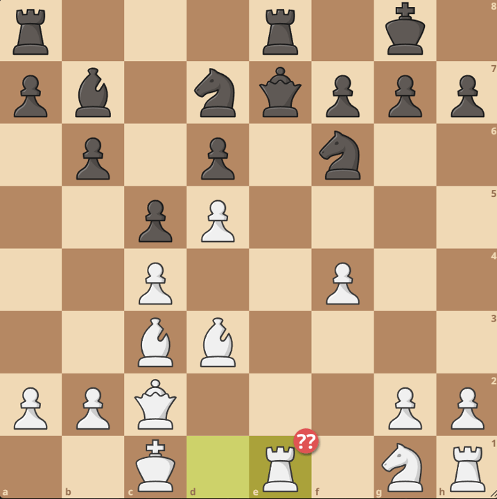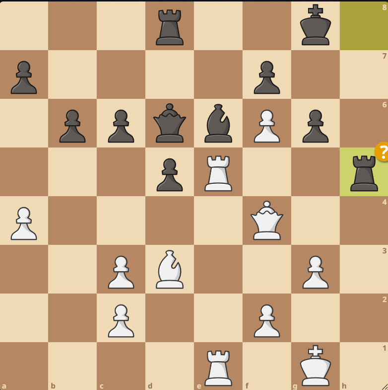 The best move for white in Dave’s round 6 game is Rxe6! Ripping open black’s king safety. If Qxf4 then white has Re8+ and ultimately wins a piece. If black instead plays fxe6 then white plays Qg4! threatening to do Rxe6 and simply Qxg6. Even if black avoids checks with Kf8, white still plays Qxg6 and despite being an exchange down, the black king is too weak.