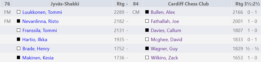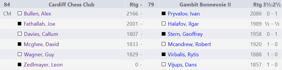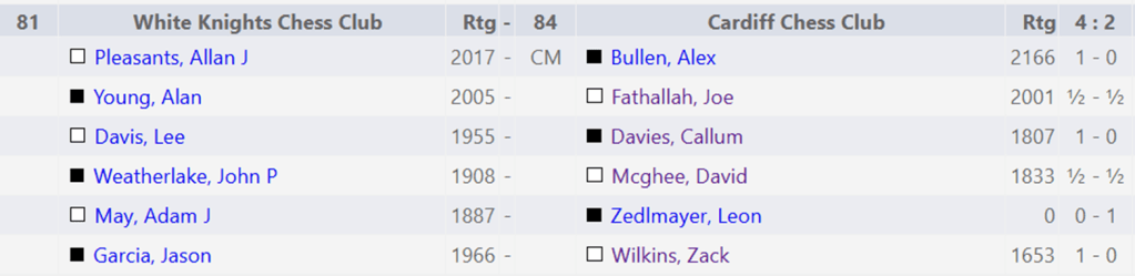 Round 4 saw Cardiff play a fellow welsh team, White Knights. We managed to score another 2-4 result with some admirable draws and another great win by Leon who at this point is becoming a real trump card for Cardiff.