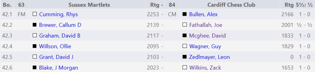 Round 5 presented an interesting opportunity for Cardiff. While we slightly outgraded our opponents on the top two boards, they held a slight rating edge on the bottom four. It was a surprise, then, when our lower three boards delivered upsets! With Joe’s draw on board two, Cardiff ended up winning the match 3.5-2.5. Apparently, the match was won with a time scramble by Guy Wagner who ultimately clinched the win in the final seconds. So the primary goal of winning one match was achieved. Could Cardiff get another? And as to the secondary goal, everyone except for Zack has managed to score something, so he would be pushing hard for that result in the last two rounds.